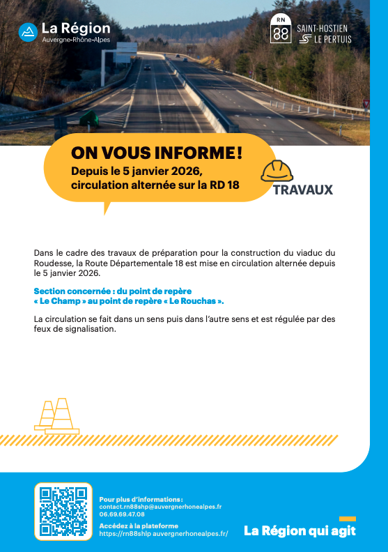 Travaux en cours 29 janv Partager Copier le lien Partager sur Facebook Partager sur X Partager par email Retrouvez sur cette page les dernières informations concernant les travaux en cours dans le cadre de la réalisation de la déviation de la RN 88 entre Saint-Hostien et Le Pertuis. Circulation alternée sur la RD 18 depuis le 5 janvier Cliquer pour visualiser le document